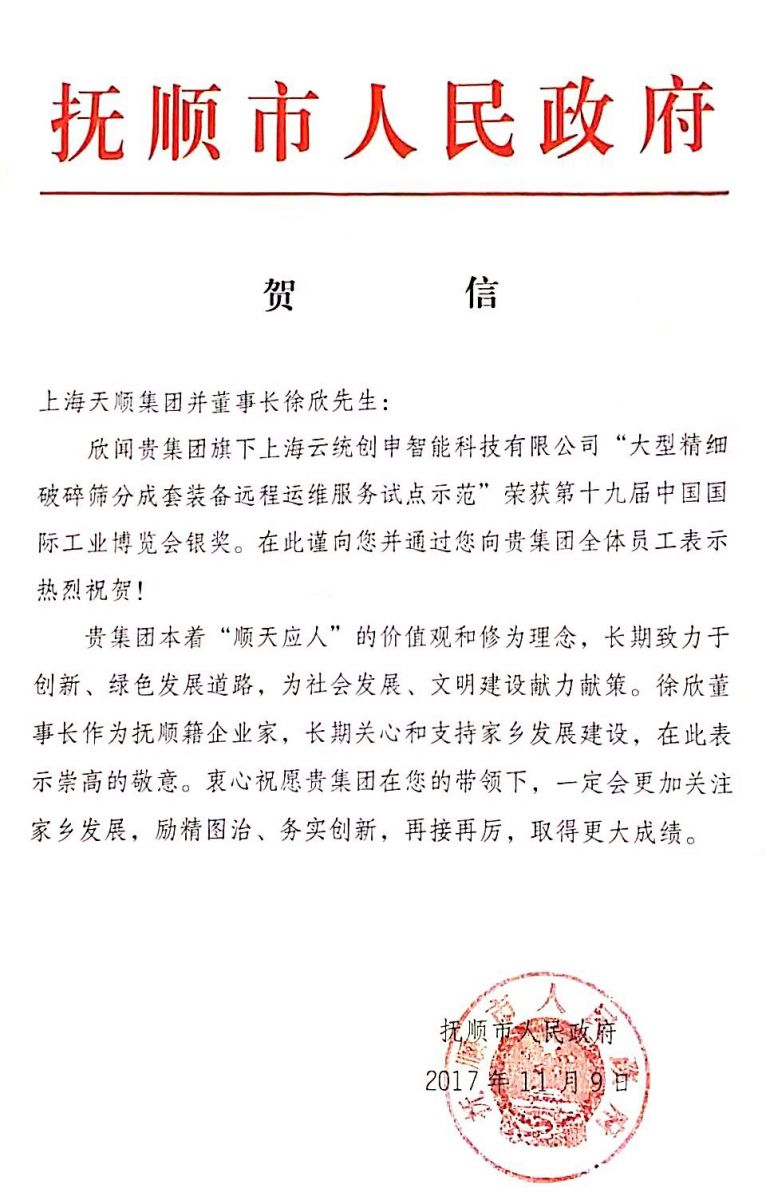 2017年11月9日,遼寧省撫順市工業(yè)和信息化委員會(huì)黨委書記 趙晨陽(yáng) 授市長(zhǎng)委托代表?yè)犴樖姓畬3坦馀R云統(tǒng)創(chuàng)申展臺(tái)。另外,遼寧省撫順市人民政府駐上海聯(lián)絡(luò)處 肖健主任,朱東新處長(zhǎng)等領(lǐng)導(dǎo)也光臨云統(tǒng)創(chuàng)申展臺(tái)。徐欣董事長(zhǎng)與撫順市相關(guān)領(lǐng)導(dǎo)合影留念。