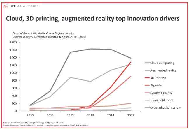 基于10的增長因數(shù),3D打印/增材制造(AM)或?qū)⒊蔀楣I(yè)技術(shù)的未來趨勢。為了在未來1年或者2年內(nèi)成為"工業(yè)4.0"相關(guān)專利的一顆流星,3D打印緊跟增強現(xiàn)實和云計算的腳步。特別有趣的是,3D打印不是一種特定的網(wǎng)絡(luò)技術(shù),因為它有資格作為一種新的生產(chǎn)方式,因此是硬件基礎(chǔ)。